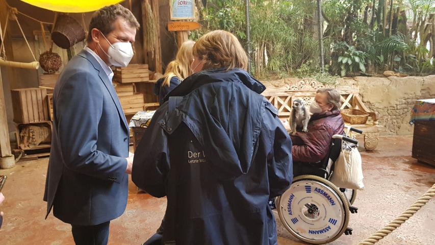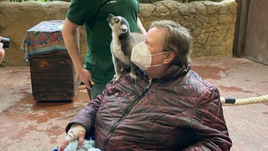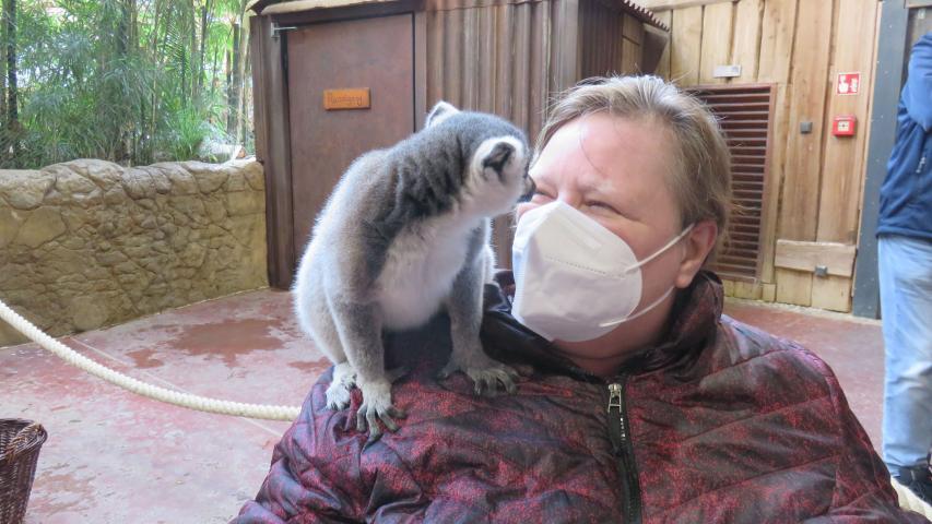 Wir fahren nach Hamburg (wo Heidi noch nie war…), Heidis Tochter Talie wartet vor dem Tor auf uns. Hagenbeck - Tierpark und Tropen-Aquarium - wir haben unser Ziel erreicht. Herzlich werden wir von Frau Wilke, einer Mitarbeiterin der Pressestelle, in Empfang genommen. Sie hat unsere Eintrittskarten dabei, wir sind eingeladen. Das ist großartig, da der Wünschewagen ausschließlich spendenfinanziert ist. Heidi ist heute der Stargast und erfährt von Frau Wilke eine Menge über die Geschichte und die beeindruckende Anzahl von Tieren im Park. Ich schiebe den Rollstuhl, (das mache ich gerne, damit ich mit meinem schlechten Orientierungssinn nicht irgendwo verloren gehe…), aber jetzt bin ich auch ganz nahe dabei, als wir in das Tropen-Aquarium gehen, um die Kattas zu besuchen. Diese kleinen, wuseligen Tiere kommen ursprünglich aus Madagaskar, dort ist es deutlich wärmer als in Hamburg. Die Temperaturen sind angepasst, es ist herrlich warm, als ich Heidi ganz nah an die Absperrung schiebe. Sie ist total aus dem Häuschen, als der Tierpfleger erlaubt, dass sie zu ihm kommen und mit füttern darf. Wir machen unzählige Fotos, obwohl Heidi anzusehen ist, dass sie diesen Moment niemals vergessen wird. Die Tiere dürfen nicht angefasst werden, was unglaublich schwerfällt, da sie so niedlich und wahnsinnig kuschelig aussehen. Heidi spürt das weiche Fell, als die Kattas auf ihre Schulter und ihren Schoß klettern, um die Leckerlies von ihr anzunehmen. Dass der Zoologische Direktor Dr. Westhoff extra zu uns kommt, um Heidi zu begrüßen, nimmt sie nur am Rande war. Gegen die Kattas hat einfach niemand eine Chance, dafür sind sie zu süß.