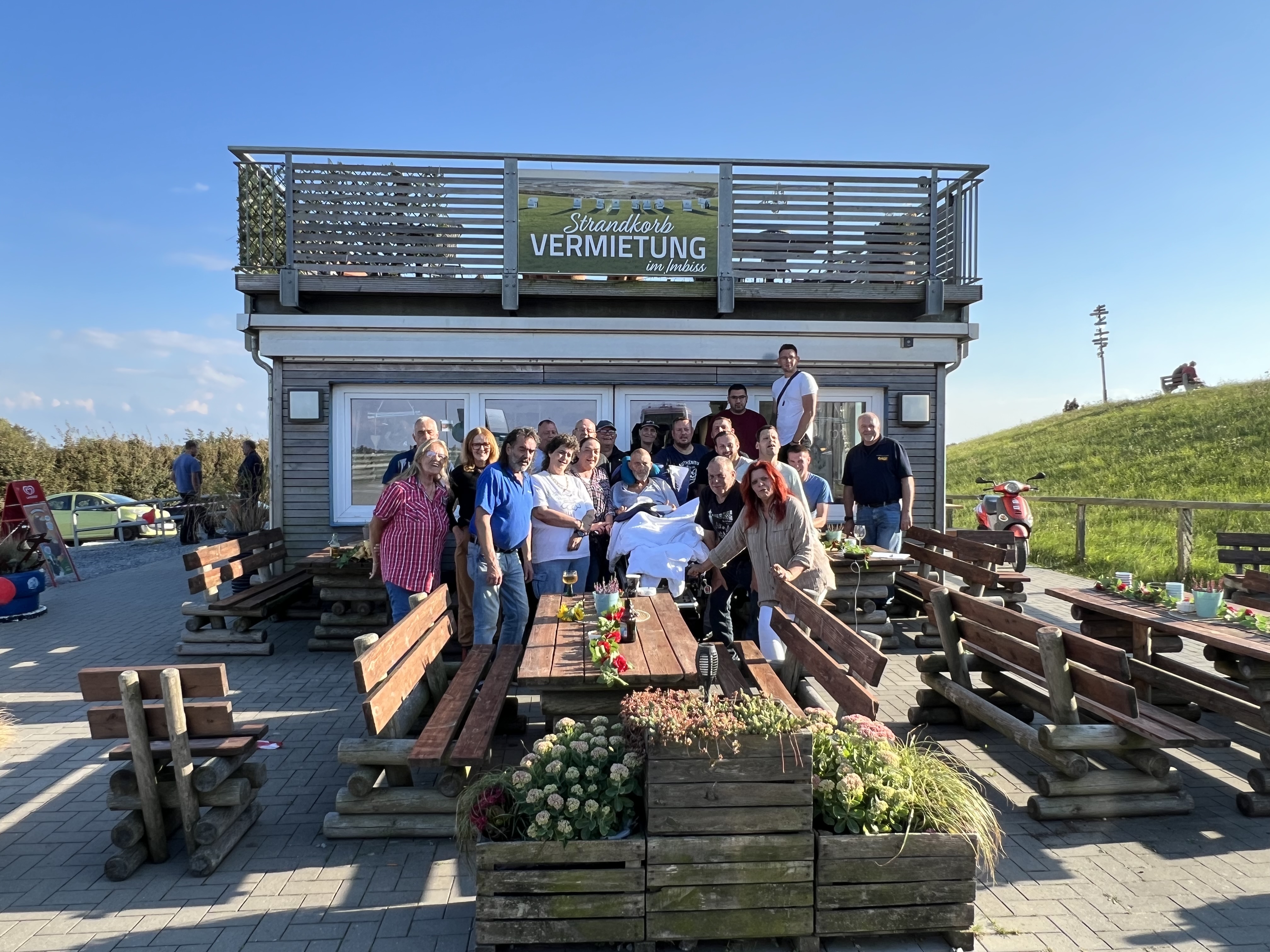 Weiter ging es zum @Bistro Fuhlehörn, wo ein liebevoller Empfang für den langjährigen Freund und Stammgast bereitet worden war. An Frerks Lieblingssitzplatz findet man jetzt ein Foto von ihm mit der Aufschrift „Reserviert bis in alle Ewigkeit – Frerk“.