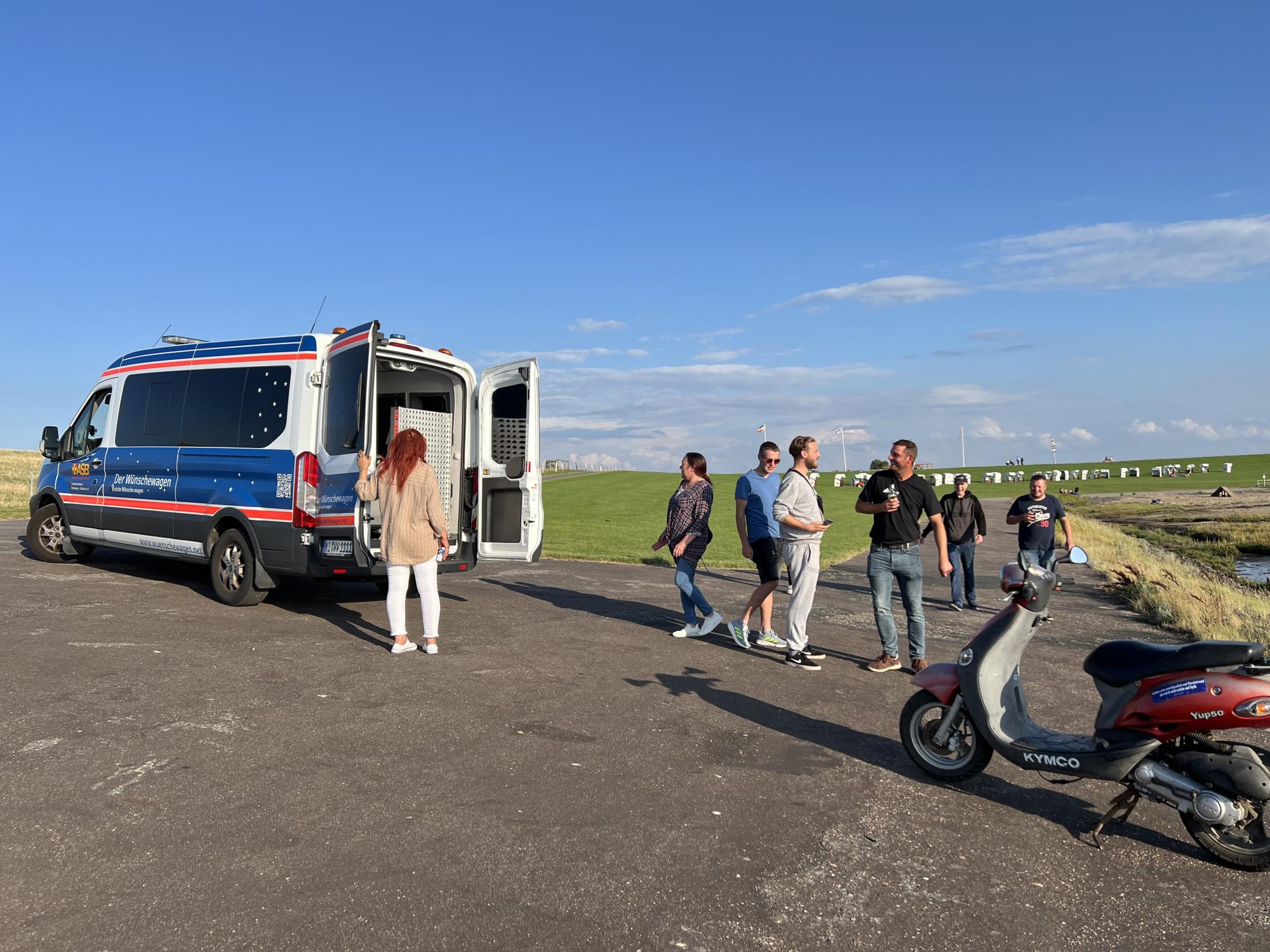 Bei der Fahrt über die Köge erwischte uns ein heftiger Regen, skeptisch beobachteten wir die Wolken. Auf Nordstrand jedoch erwartete uns schönstes Wünschewagenwetter mit wenig Wind, sodass Frerk bei unserem ersten Zwischenstopp am Süderhafen die Aussicht durch die geöffneten Hecktüren genießen konnte.