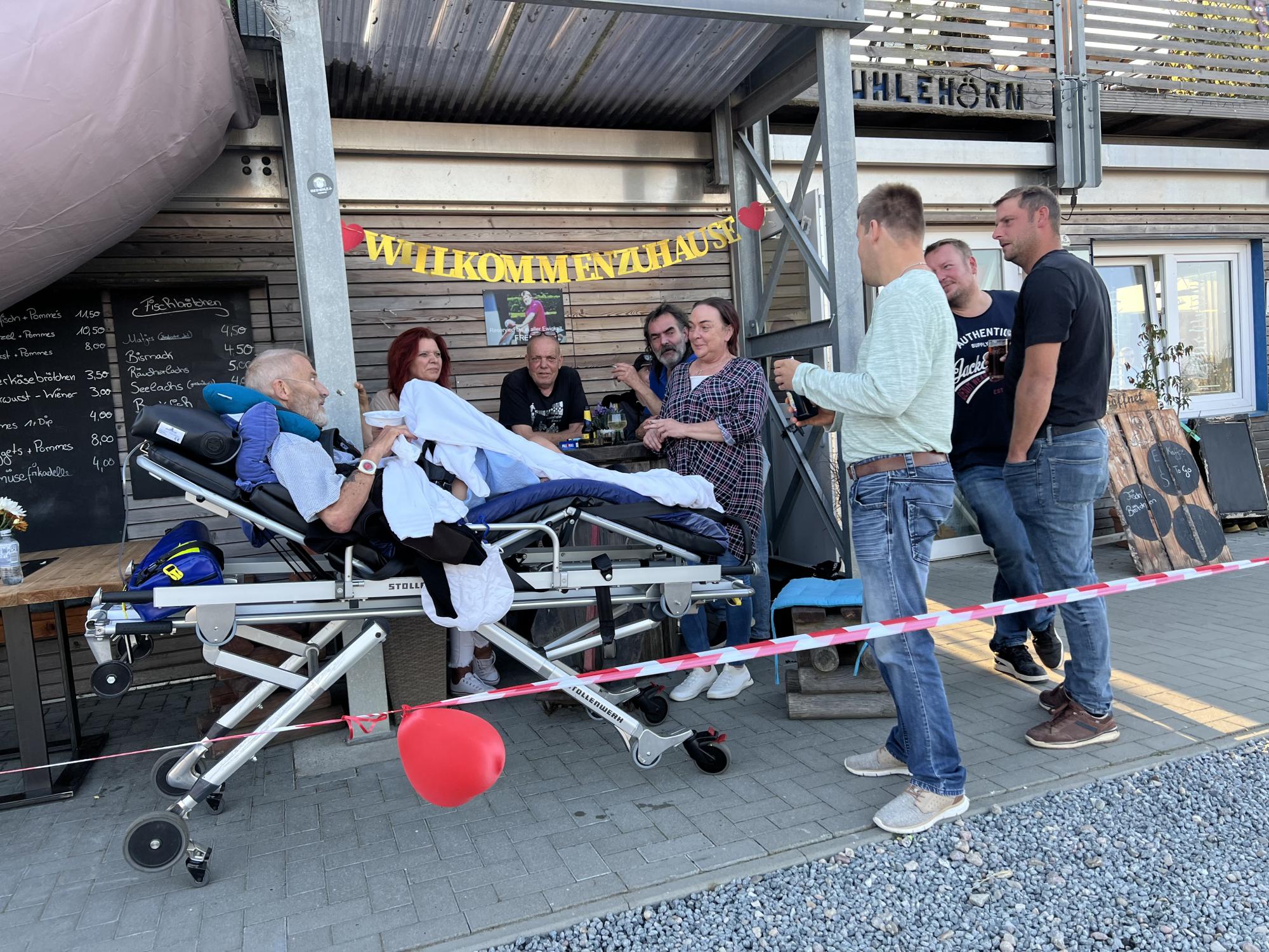 Eine Girlande begrüßte uns mit „Willkommen Zuhause“. Fast dreißig Freunde und Familienmitglieder erwarteten ihn dort. Eines der Highlights war für Frerk, dass sein alter Roller, den er in gute Hände weitergegeben hatte, wieder lief.