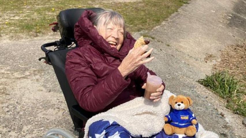 Mit den Fischbrötchen und einem Aal im Gepäck machen wir uns auf den Weg zu unserer „VIP-Location“. Herr Traulsen hat seinen Teil unserer Arbeitsteilung optimal erfüllt und erwartet uns vor Ort. Wir dürfen auf die Terrasse des „Pier-Speicher“, eine tolle Location, direkt mit Blick auf den Hafen, wo wir windgeschützt sitzen können. Das Team vor Ort ist reizend, der Kaffee sehr lecker (Ich komme wieder!) und das Fischbrötchen scheinbar die absolute Erfüllung. Herr Traulsen bleibt, schnackt mit Clara und Lucie über den Wunsch, nach Kappeln zu kommen (was er scheinbar sehr gut verstehen kann), mit Laura und Patrick über den Wünschewagen, Fahrkünste (vermutlich meine) und ich bin ein bisschen begeistert, wie schön dieser Tag bereits ist. Clara macht sich zwischendurch jede Menge Gedanken. Ob Herr Traulsen nicht friert, weil er nur ein Jacket trägt. Ob der Aal, den wir gekauft haben, nicht zu teuer ist. Ob ich wirklich den schweren Rollstuhl schieben kann, weil ich einige Tage vorher gefallen bin und meine Hände etwas lädiert sind. In all dem steckt so was wie eine Unsicherheit, ob sie „diesen ganzen Aufwand wirklich wert ist“ - Lucie bestätigt, dass es für ihre Mutter gar nicht so leicht ist, das alles anzunehmen. Ja, liebe Clara, das warst und bist du, inkl. Fischbrötchen und allem, was dazu gehört! Den Fahrgästen entstehen nie Kosten, weil das, was wir bezahlen, vom ASB übernommen wird – weil es viele Spenderinnen und Spender gibt. Umso schöner, wenn wir, wie in diesem Fall, zum Kaffee eingeladen werden. Danke!